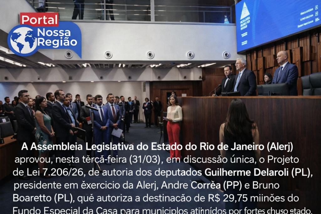 A Assembleia Legislativa do Estado do Rio de Janeiro (Alerj) aprovou, nesta terça-feira (31 de março), em discussão única, o Projeto de Lei 7.206/26, que autoriza a destinação de R$ 29,75 milhões do Fundo Especial da Casa para municípios devastados pelas fortes chuvas que atingiram o estado do Rio de Janeiro. A medida, de autoria dos deputados Guilherme Delaroli (PL), presidente em exercício da Alerj, André Corrêa (PP) e Bruno Boaretto (PL), contou com a coautoria estendida a todos os parlamentares da Casa.