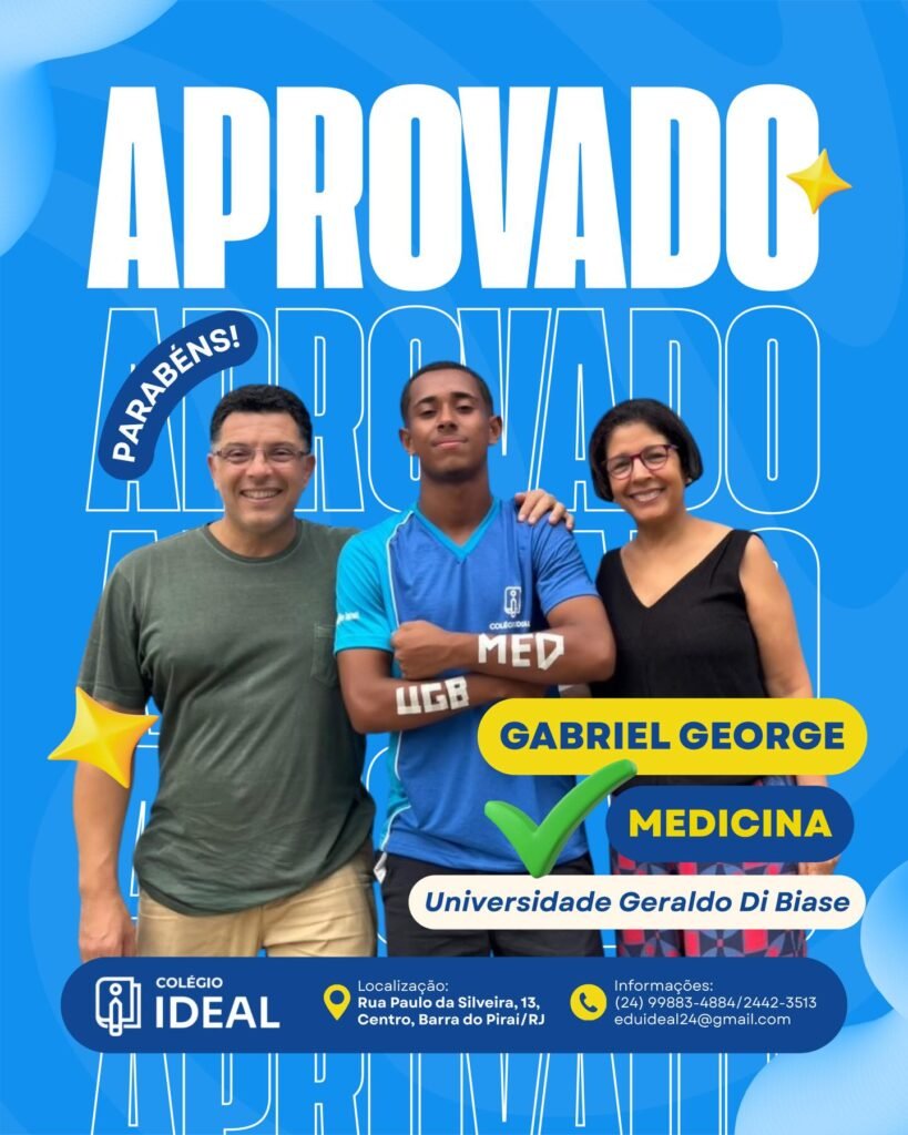A aprovação em um dos cursos mais concorridos do país não acontece por acaso. Para Gabriel George, aluno da 2ª série do Ensino Médio, a vaga em Medicina na UGB é o coroamento de uma trajetória construída com propósito. Esse resultado destaca o Colégio IDEAL como uma força emergente no cenário educacional de Barra do Piraí, herdando a expertise de três décadas do Jardim Escola Rosângela Silveira.