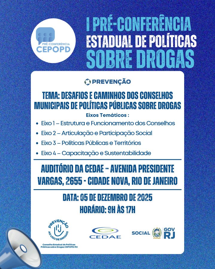 RIO DE JANEIRO – Aconteceu a 1ª Pré-Conferência Estadual de Políticas sobre Drogas, um marco para o diálogo e a reflexão sobre os desafios e caminhos para o fortalecimento dos Conselhos Municipais de Políticas sobre Drogas (COMADs) em todo o estado. O evento reuniu representantes da sociedade civil, gestores públicos e especialistas, sublinhando a urgência de políticas eficazes e integradas entre Saúde, Assistência Social, Segurança Pública e Educação.