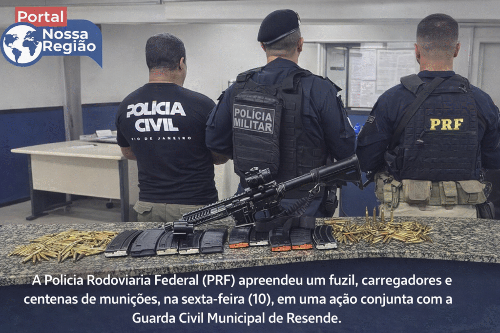 Uma ação conjunta da Polícia Rodoviária Federal (PRF) e da Guarda Civil Municipal de Resende, com apoio das polícias militar e civil, resultou na apreensão de um fuzil, dez carregadores e 263 munições de calibre 5,56mm. O flagrante ocorreu na noite de sexta-feira (10), em Resende, no Sul Fluminense, e terminou com a prisão de dois homens, de 19 e 35 anos.