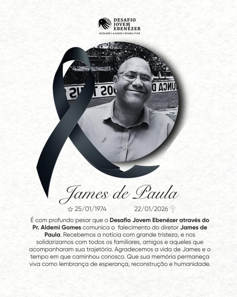 É com profundo pesar que o Portal Nossa Região lamenta o falecimento de James de Paula, nascido em 25 de janeiro de 1974, que nos deixou no dia 22 de 2026.