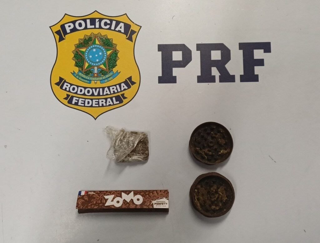 Durante a inspeção, a PRF encontrou uma bucha de maconha escondida em um maço de cigarros, além de acessórios para consumo (dichavador e papel de seda). Um dos passageiros assumiu a posse do entorpecente para consumo próprio.
