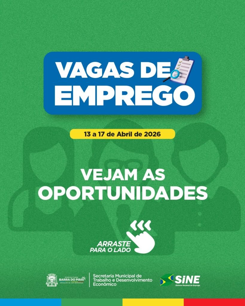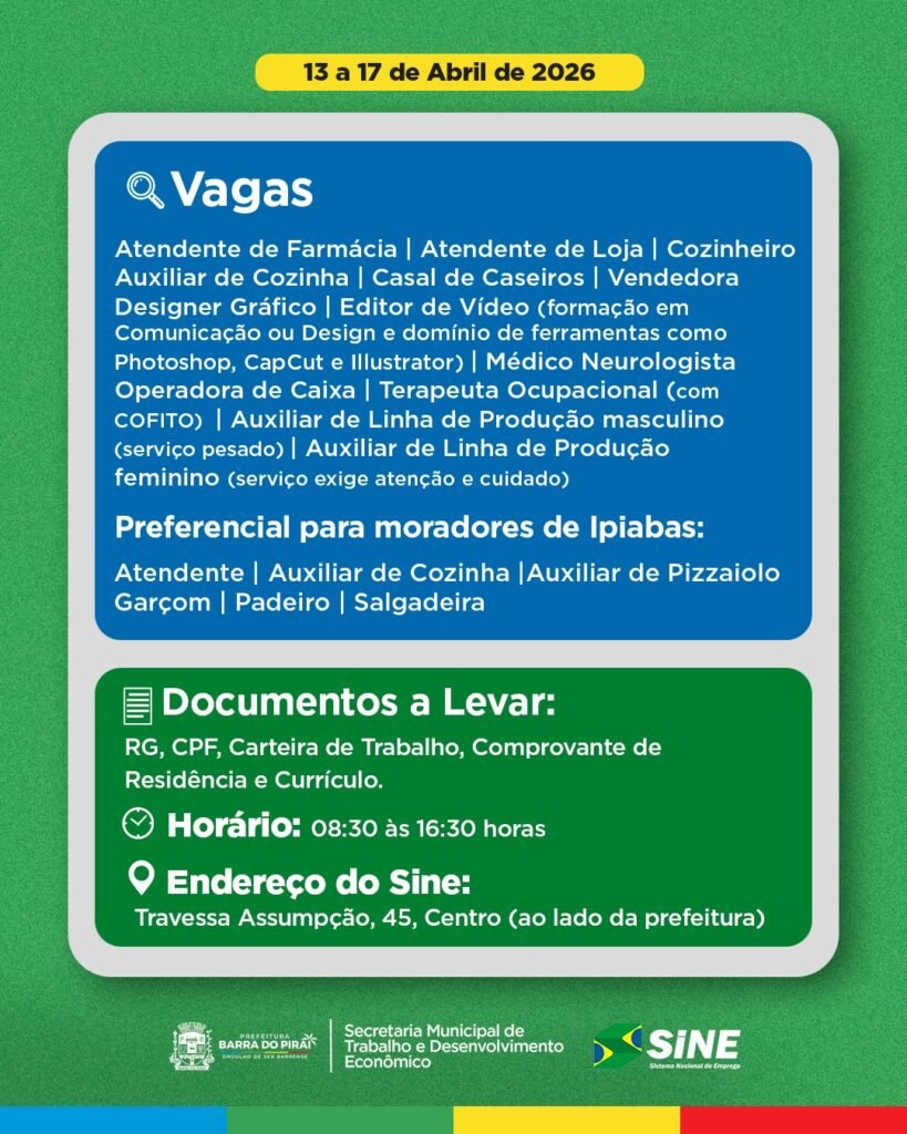 SINE de Barra do Piraí acaba de anunciar uma verdadeira corrida por empregos nesta semana. Entre os dias 13 e 17 de abril, dezenas de vagas estão disponíveis em diferentes áreas, ampliando as chances para quem busca recolocação ou o primeiro emprego.